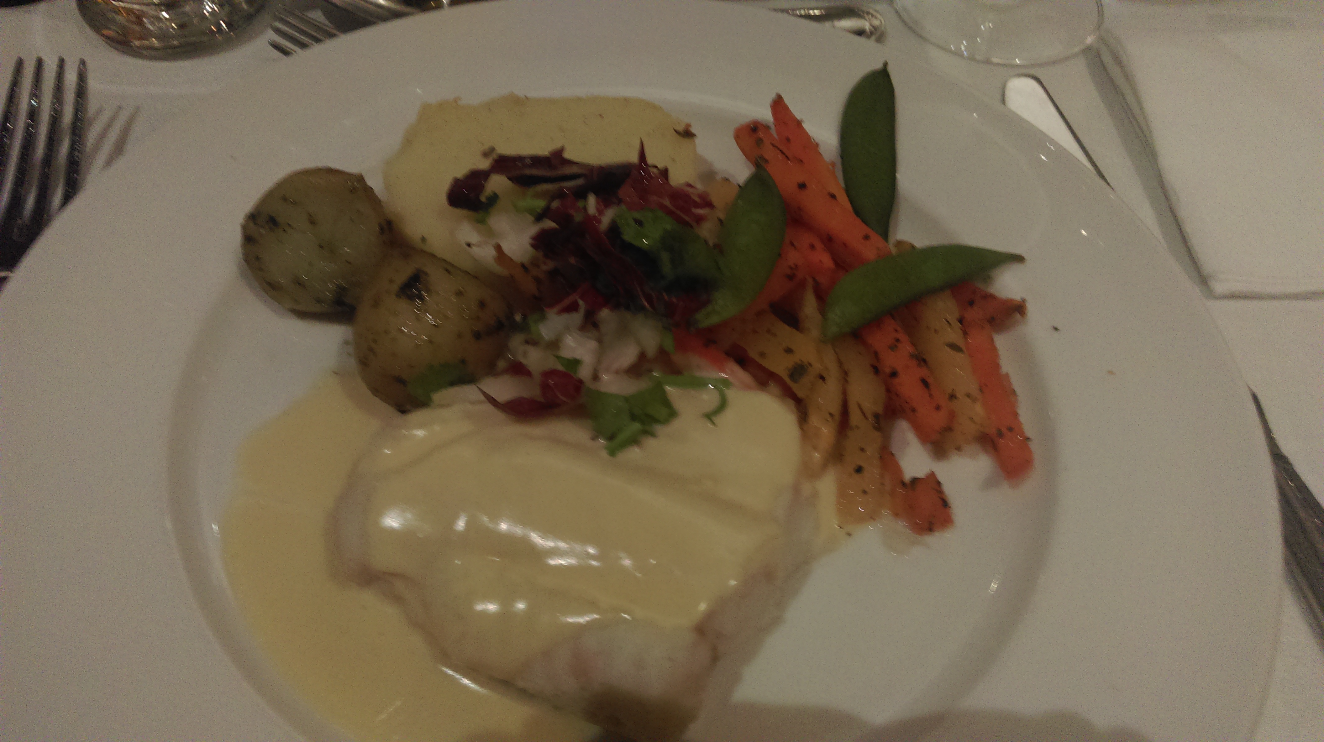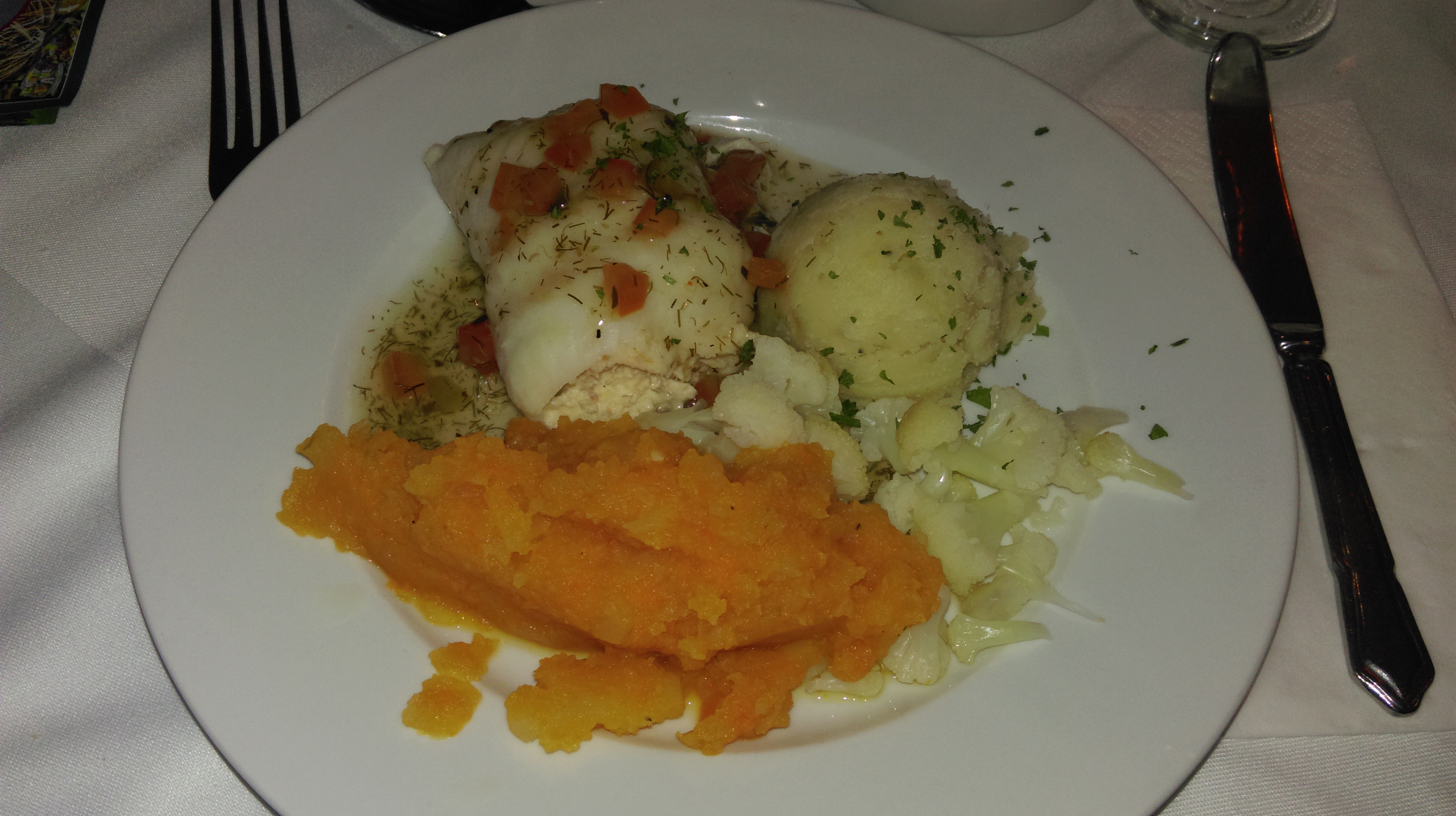 Hauptspeise: Gebratene Hähnchenbrust mit Pfeffersoße oder gedünstetes Kabeljaufilet mit Souce Hollandaise