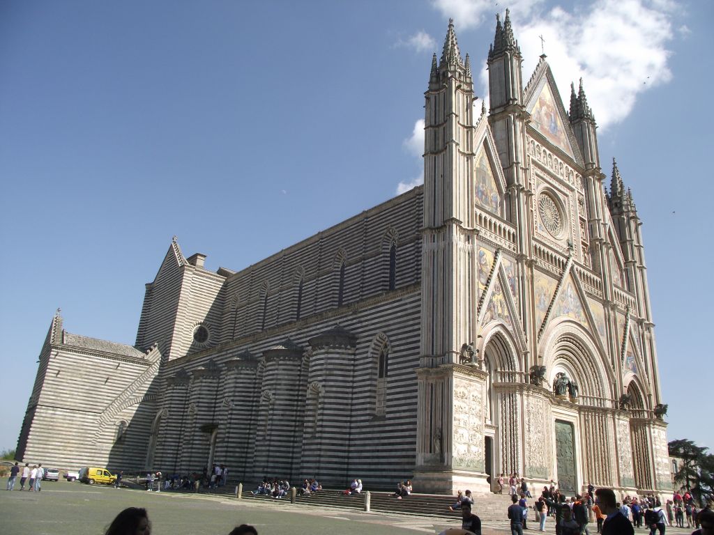 Schon von weitem erblicken wir die auf einen 400m hohen Tuffsteinblock über dem Pagliatal liegende Stadt, die auch wegen ihres vorzüglichen Weisweins bekannt ist. Mit der Picolina fahren wir nach oben und bei einem Spaziergang durch die winkligen Gassen sehen wir neben den vielen Baudenkmälern auch den Dom, der als eines der schönsten Bauwerke Italien giblt. Er wurde anlässlich des Wunders von Bolsena 1285 gegründet. Im inneren ist er reich mit fresken ausgestattet.