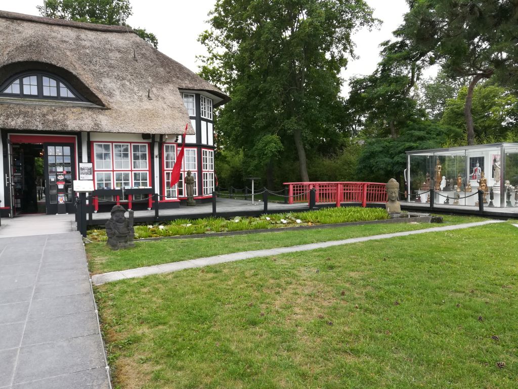 Kleiner Buchladen in einem asiatisch angehauchten Garten mit Kois, Budda Statuen und vieles mehr.