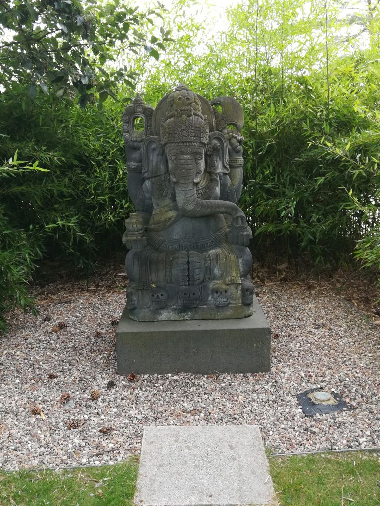 Statue einer indischen Gottheit auch in diesem Garten.