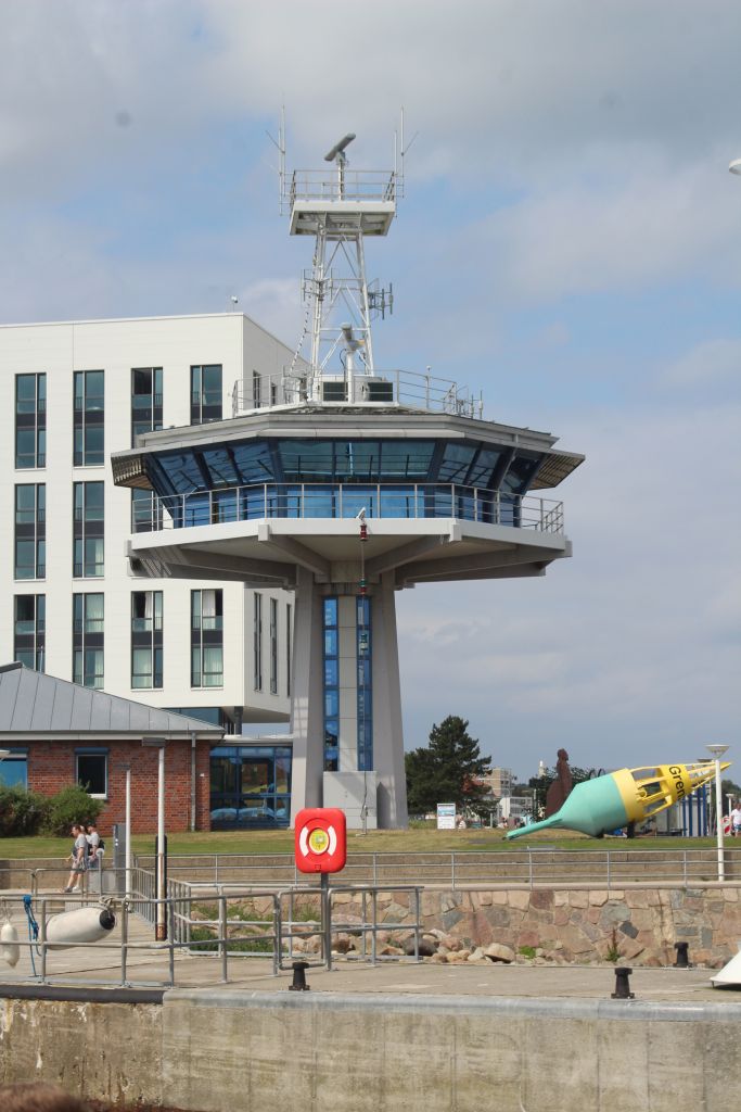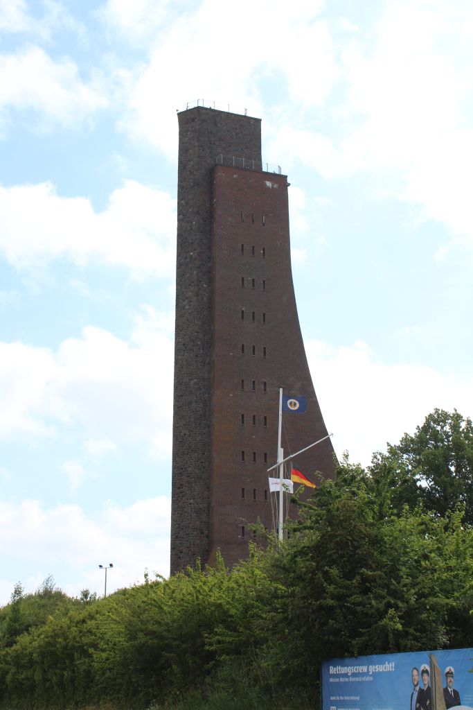 Eingang zum Turm. Wir sind mit dem Aufzug zur Aussichtsplattform gefahren. Sehr schöner Ausblick auf die Kieler Bucht.
