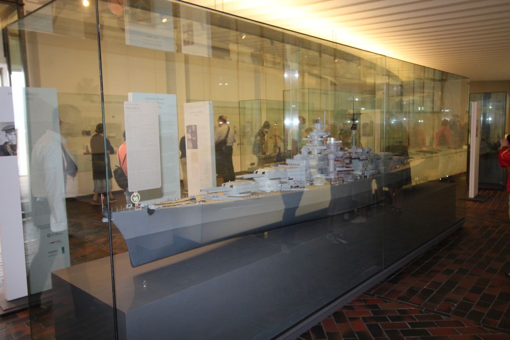In der Mitte stehen Maßstabsgerechte Modell von Schiffen aus allen Epochen. Besonders sticht hier das größte Modell ins Auge: Die Bismark.