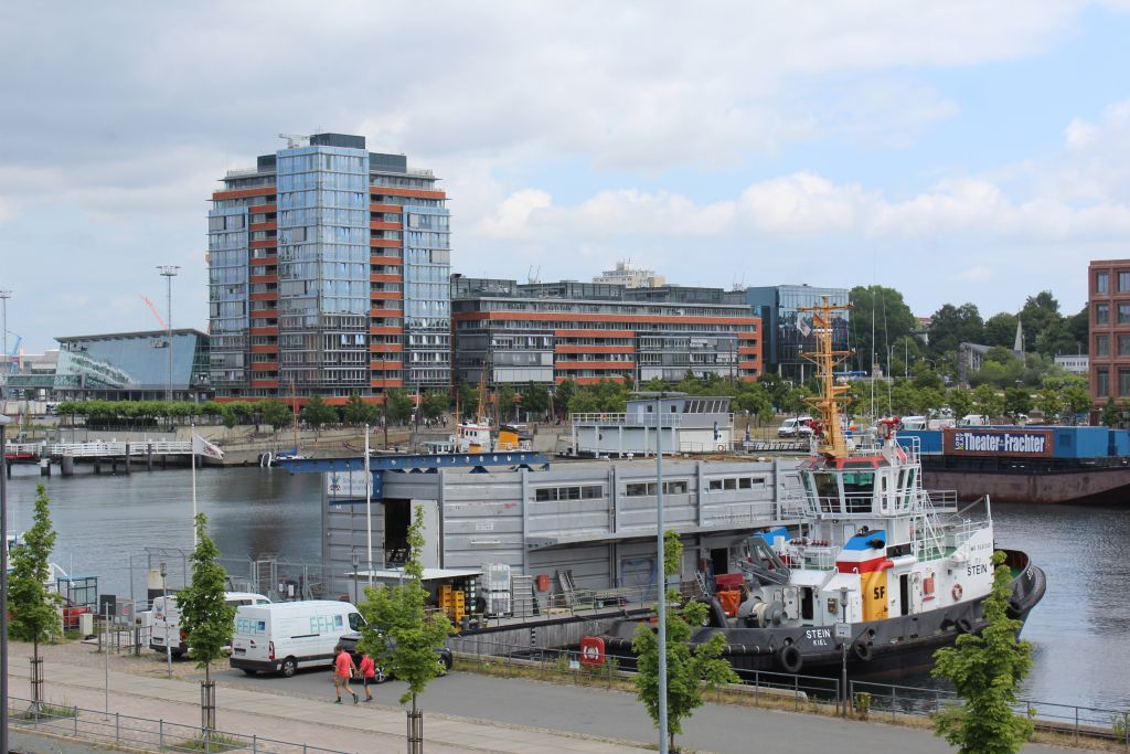 Nach dem Verlassen des Parkhauses gleich ein schöner Blick auf den Kieler Hafen.