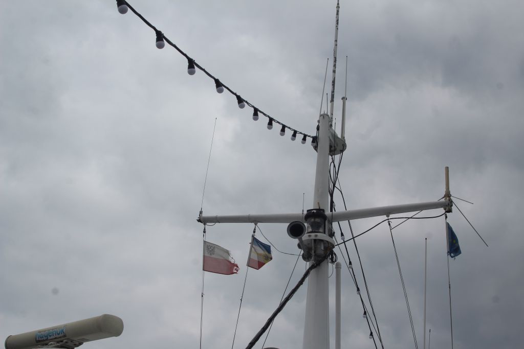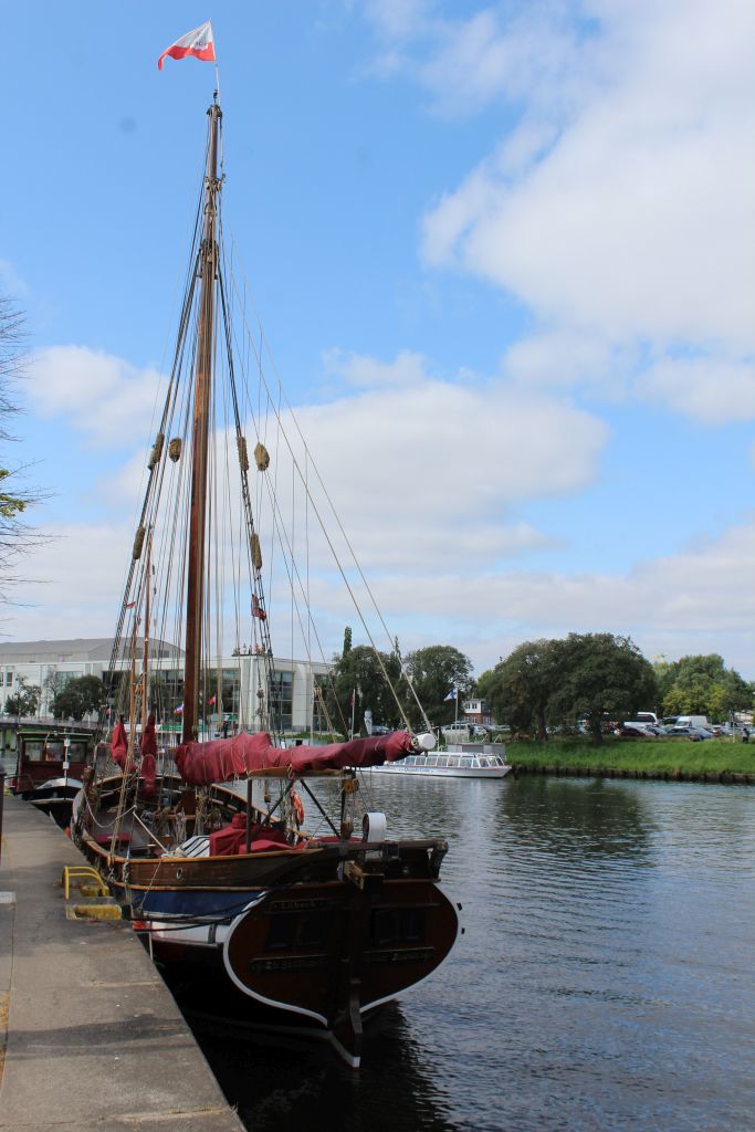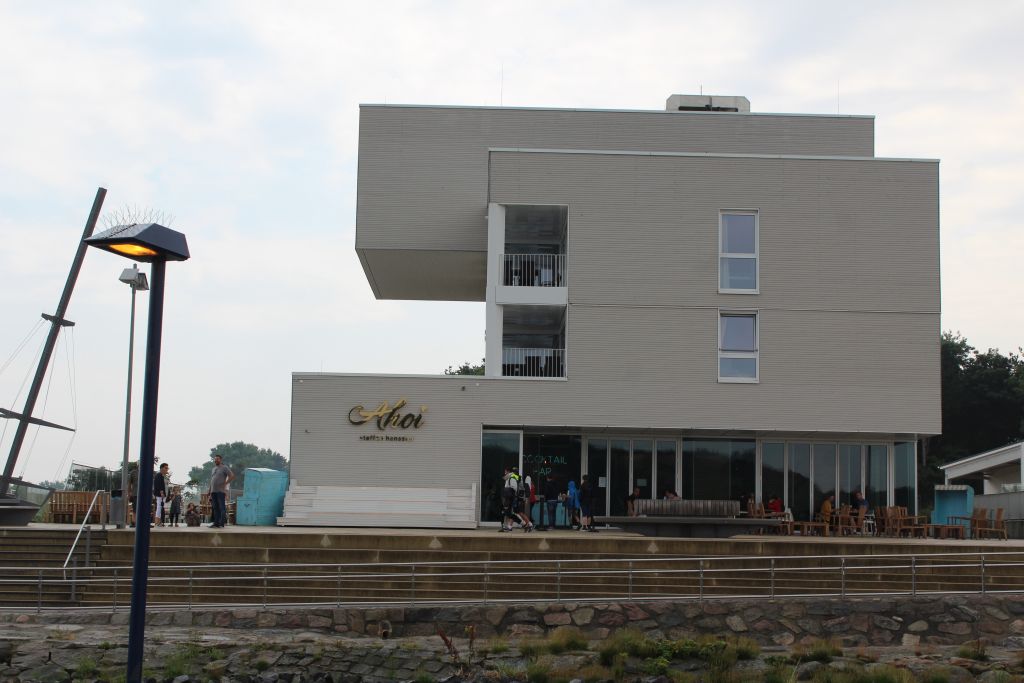 Ein altes Schiff liegt gegenüber. Der Museumshafen.