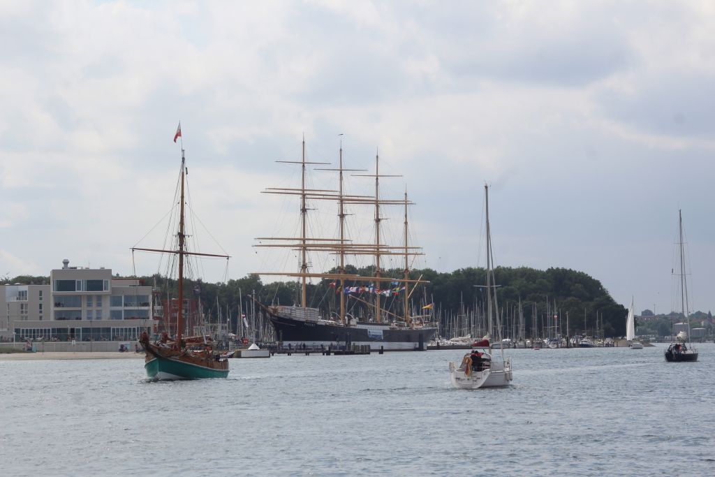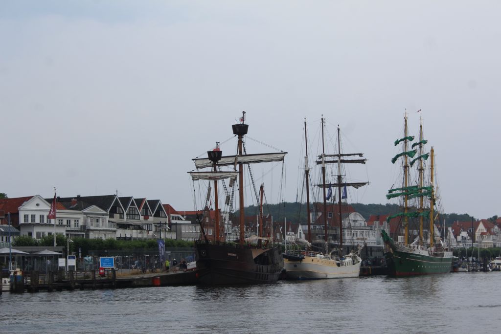 Überfahrt nach Priwall. Blick auf die im Hafen liegenden Segelschiffe.