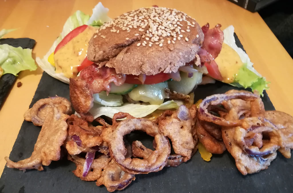 Ich koche mittlerweile gerne. Weniger Hausmannskost oder Omasküche dafür viel asiatische Variationen. OK, auf dem Bild ist ein Burger. Dieser ist komplett selbst gemacht. Das Brüchen ist selber gemacht mit Seasam und Dinkelmehl. Dazu eine selbstgemachte Burgersoß mit einer Majonaise als Grundlage. Diese auch selber hergestellt nach Rezept. Bakon, Zwiebeln, Tomaten und als Beilage fritierte Zwiebelringe. Einfach nur LECKER.